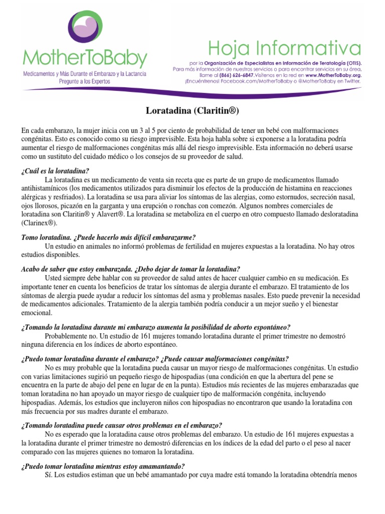 Debido al riesgo potencial que representa la administración de antihistamínicos para los lactantes particularmente recién nacidos y bebés prematuros se debe decidir acerca de suspender la Lact o suspender la administración del medicamento. Loratadina embarazo y lactancia. Está contraindicado en embarazo lactancia y en niños menores de 2 años.